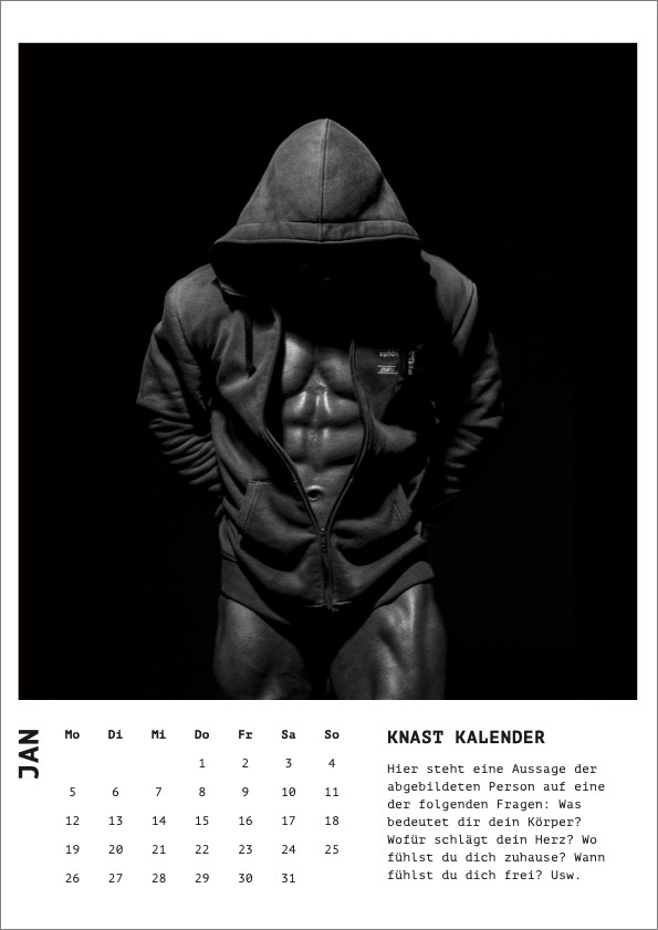Jeder Gefangene erhält kostenlos eine Mappe mit fünf Porträtfotografien im Format A4. Aus 12 ausgewählten Fotografien entsteht ein etwas anderer Bodybulding Kalender. Unter den Fotografien steht eine Aussage der abgebildeten Person auf eine der folgenden Fragen: Was bedeutet dir dein Körper? Wofür schlägt dein Herz? Wo fühlst du dich zuhause? Wann fühlst du dich frei? Usw.