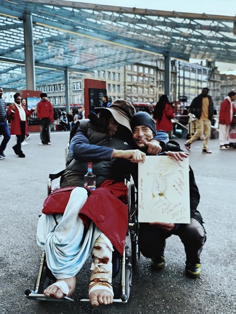 Das Bild links zeigt den obdachlosen Künstler Marc mit Stefan von Kollektiv Mami auf dem Bahnhofsplatz Bern, 11.11.2025.